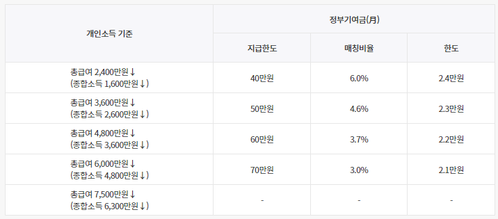 소득 납입액 총 수령금액 혜택금액 2400만원 이하 4200만원 5000만원 800만원 3600만원 이하 4200만원 4938만원 738만원 4800만원 이하 4200만원 4931만원 731만원 6000만원 이하 4200만원 4924만원 724만원 7500만원 이하 4200만원 4787만원 587만원 1 ~ 6000만 원 이하의 소득자시라면 모두 다 8% 이상의 금리이기 때문에 요새 나오는 적금보다 훨씬 높습니다.
