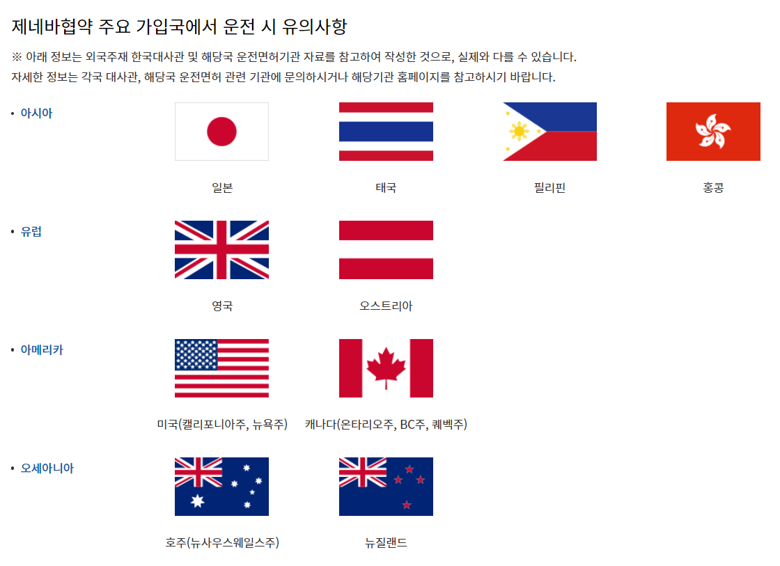 제네바 협약 주요 가입국에서의 운전 시 유의사항