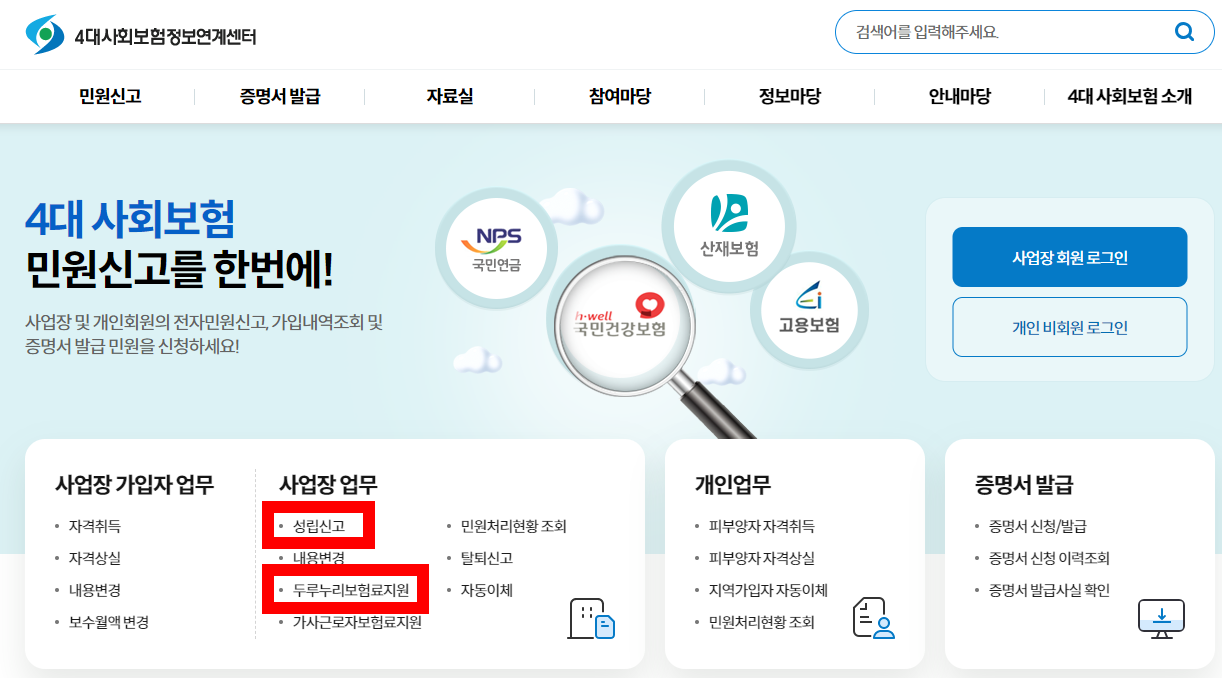 - 미가입 사업장 : 보험관계성립신고서 / 피보험자격취득신고서