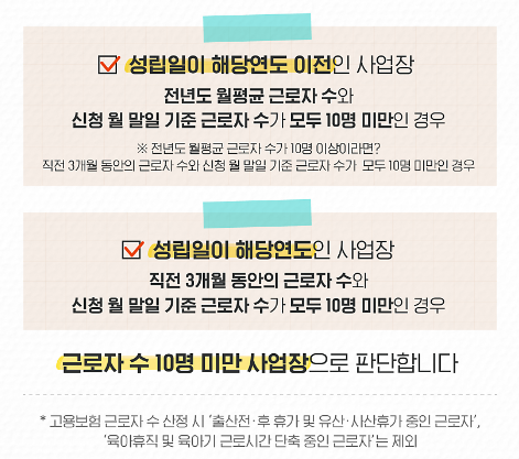 성립일이 전년도일 경우라면 월평균 근로자수가 10인 미만일 때 / 혹은 직전 3개월과 신청 월의 마지막날 기준 근로자수가 10인 미만일때 신청이 가능합니다.