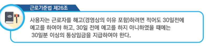 사용자는 근로자를 해고(경영상 이유에 의한 해고를 포함)하려면 적어도 30일 전에 예고를 하여야 하고, 30일 전에 예고를 하지 아니하였을 때에는 30일 분 이상의 통상임금을 지급하여야 한다.