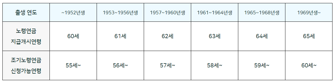- 가입기간 10년 이상, 소득이 있는 업무*에 미종사자의 경우에 한하여 지급개시연령보다 5년 빠르게 받을 수 있는 제도