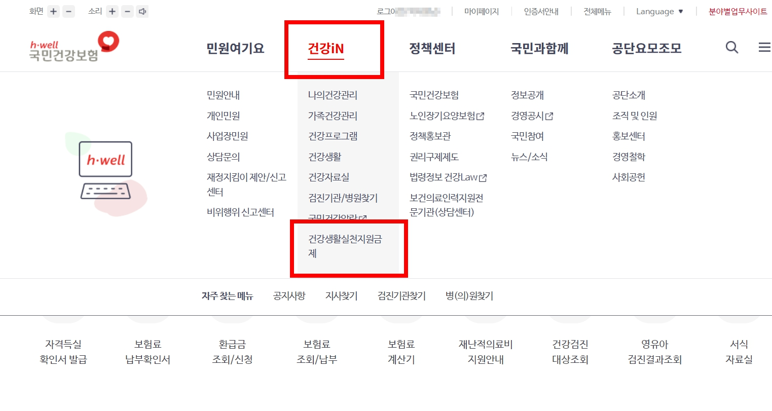 2. [건강iN] → [건강생활실천지원금제] 클릭 및 로그인