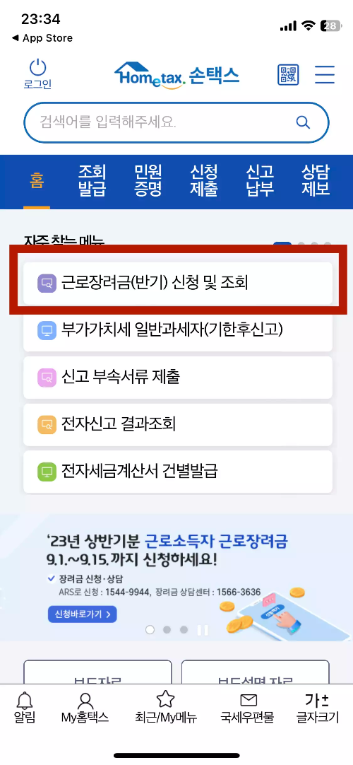 1. 손택스 애플리케이션 접속하여 메인 화면에 [근로장려금 신청 및 조회] 클릭