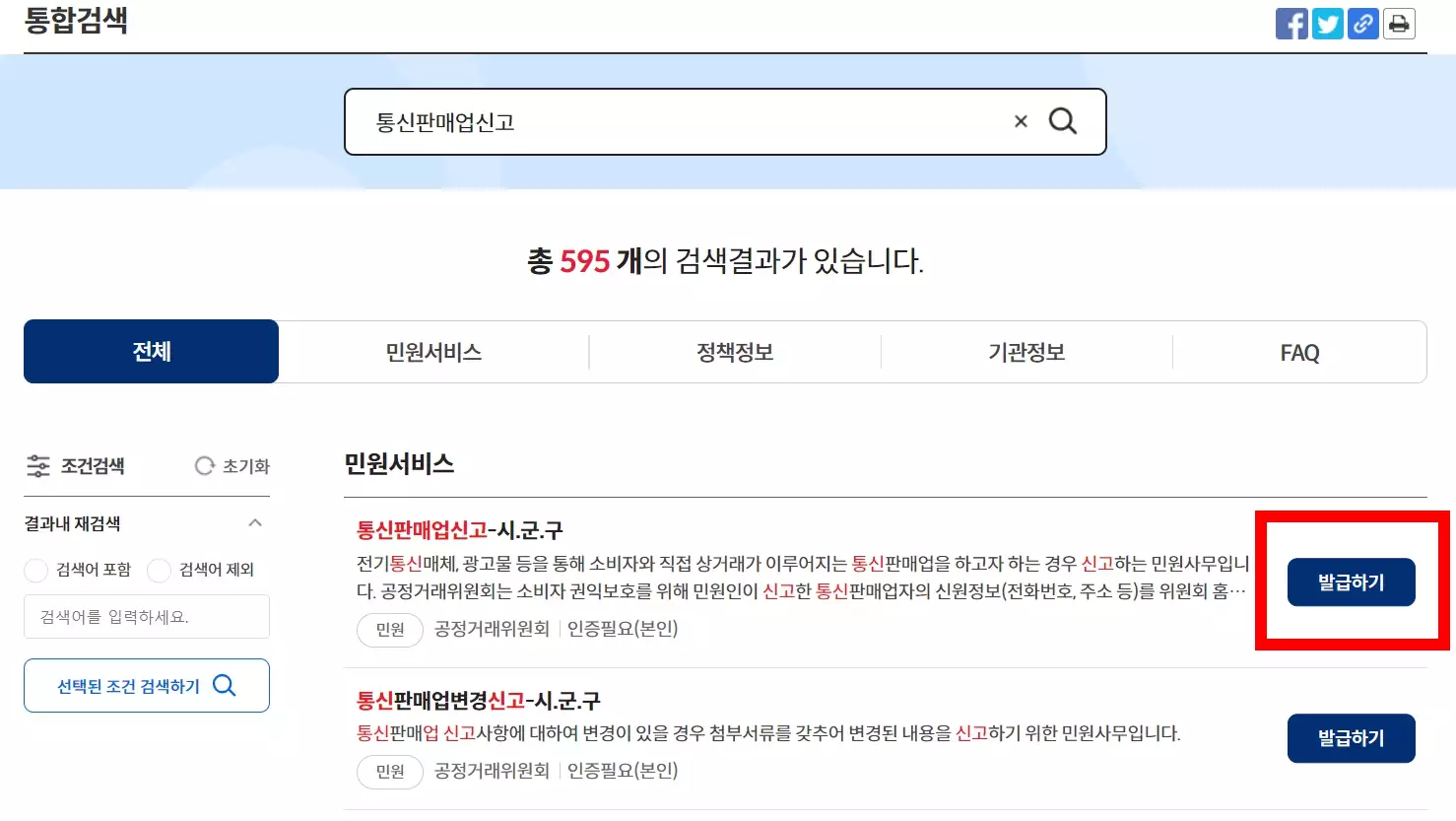 1. [정부 24] 접속 후 [통신판매업 신고] 검색하여 [발급하기]를 클릭합니다.