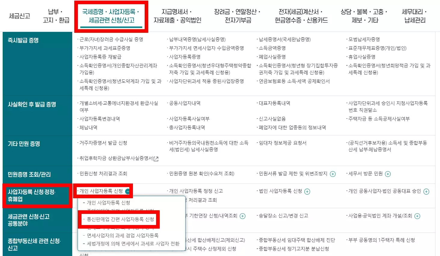 1. 상단의 [국세증명·사업자등록·세금 관련 신청/신고] → [개인 사업자등록 신청] → [통신판매업 간편 사업자등록 신청]
