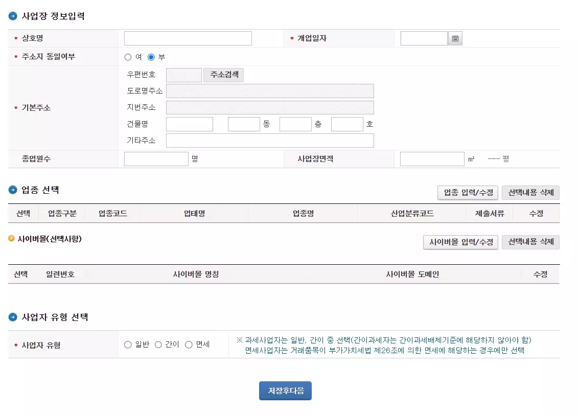 3. [사업장 정보입력] → [업종선택] → [사업자유형 간이과세자 선택]