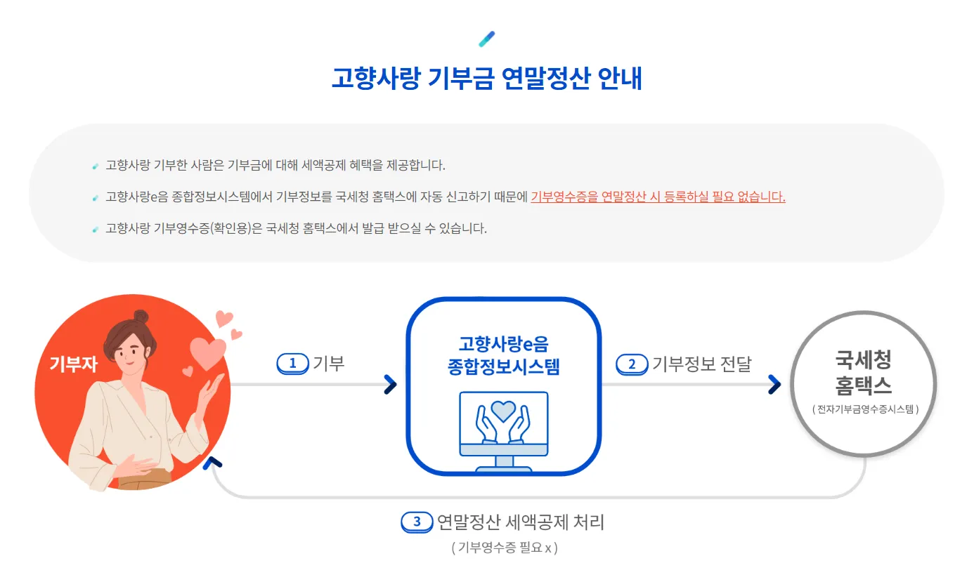 고향사랑기부금은 간편 연말정산 서비스를 통해 별도의 과정 없이 자동으로 신고가 됩니다. 따라서 기부영수증을 연말정산 시 등록할 필요가 없습니다.*영수증 발급을 원하신다면 홈텍스에서 발급 가능