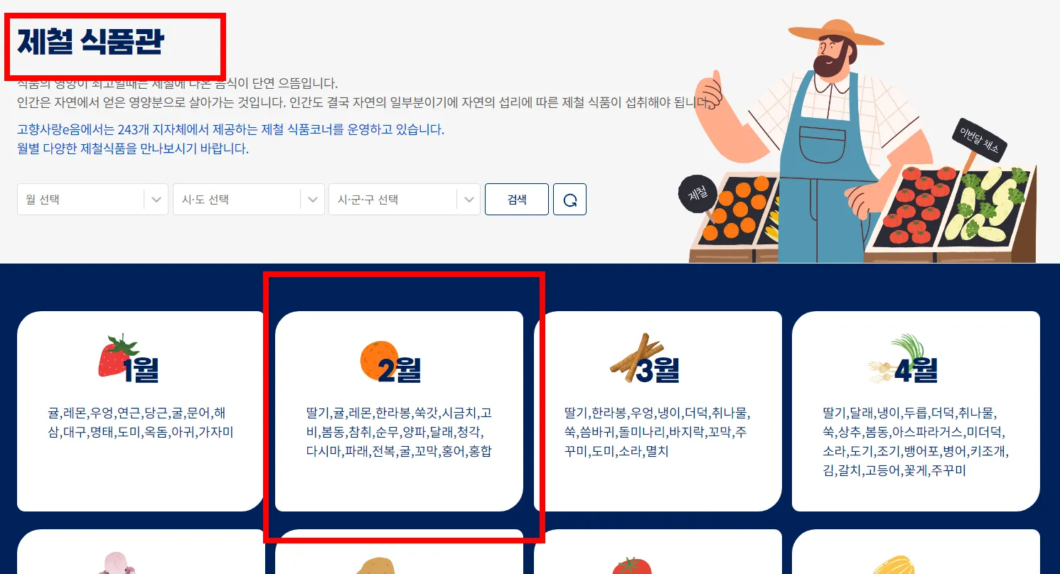 제철식품관은 월별의 제철 식품들을 리스트화한 것으로 제철 농산물을 구입하기 좋게 구성되어 있습니다.