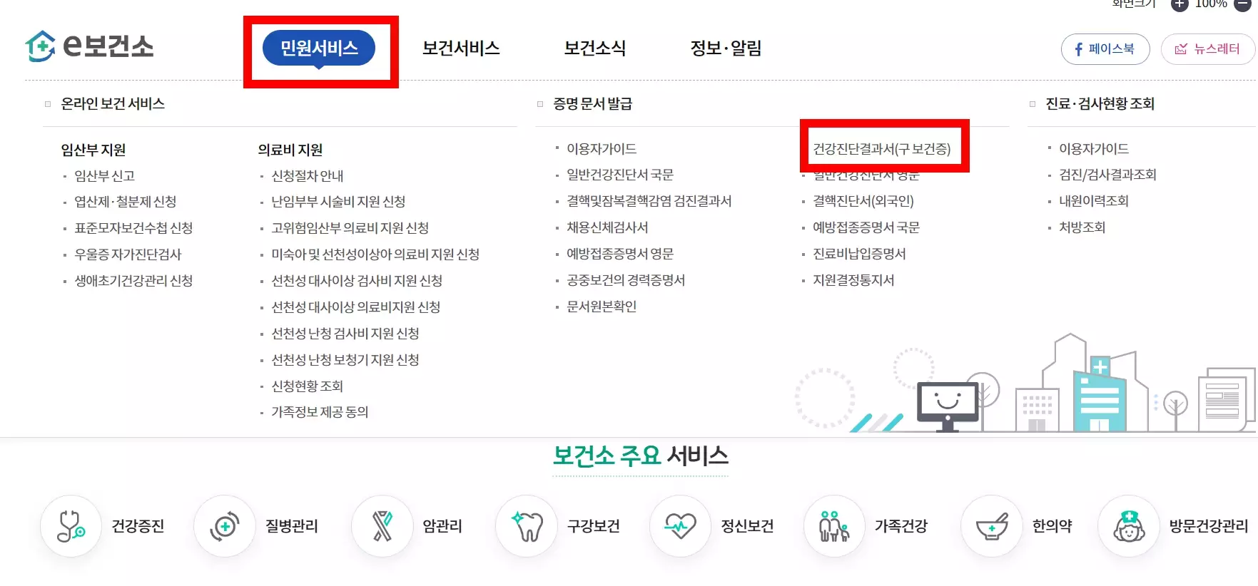 1. <e보건소> → <민원서비스> → <건강진단결과서(구 보건증)>